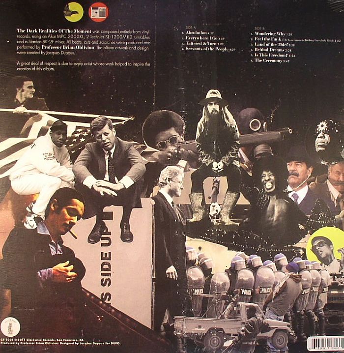 Stream this time machine graffiti dream instrumental audio scene…with traces of golden era hip hop laced in funk, rock, jazz and world styles, The Dark Realities Of The Moment was composed entirely from vinyl records, using an MPC 2000XL, 2 Technics SL-1200MK2 turntables and a Stanton SK-2F mixer. All beats, cuts and scratches were produced and performed by Professor Brian Oblivion. The album artwork and design were created by Jacques Dupoux.